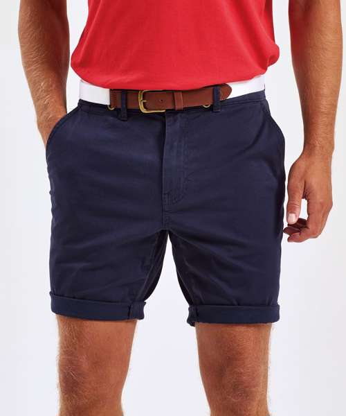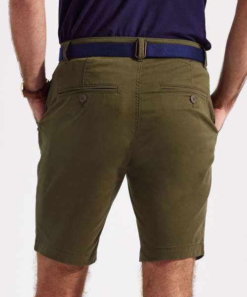 Men’s chino shorts with two swing pockets and two back jet pockets. Zip fly and button fastening to the front. Soft-finish lightweight fabric. Belt loops. Style can be worn rolled up. Product contains no branded neck label. Removable Kimble or looped garment tags. Inner seam label holds important product information on one label with a second label containing brand information which can be cut-away. Please note old stock may contain a fixed branded label.