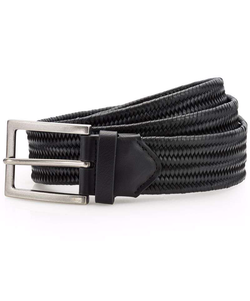 Leather braid belt. Buckle and belt loop. Adjustable length - belt can be fastened at multiple lengths due to braid stitching. Product contains no branded neck label. Removable Kimble or looped garment tags. Inner seam label holds important product information on one label with a second label containing brand information which can be cut-away. Please note old stock may contain a fixed branded label.