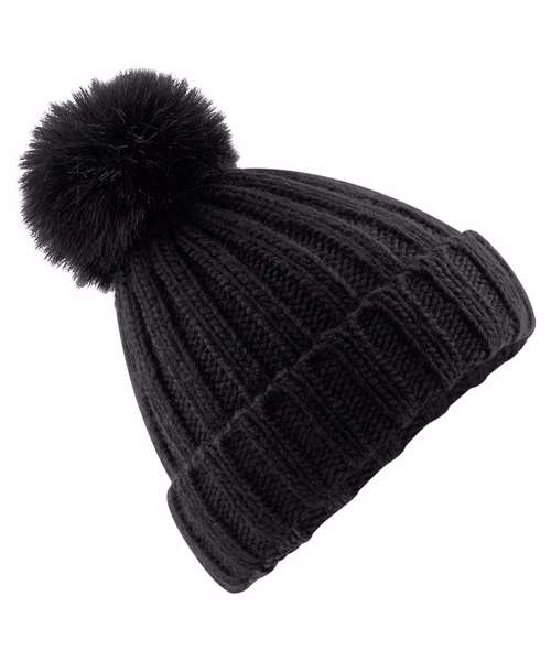 TearAway label for ease of rebranding. Luxury self-coloured faux fur pom pom. Removable pom pom for ease of washing. Unisex styling. Cuffed design for optimal decoration. Sumptuous heavy ribbed knit.