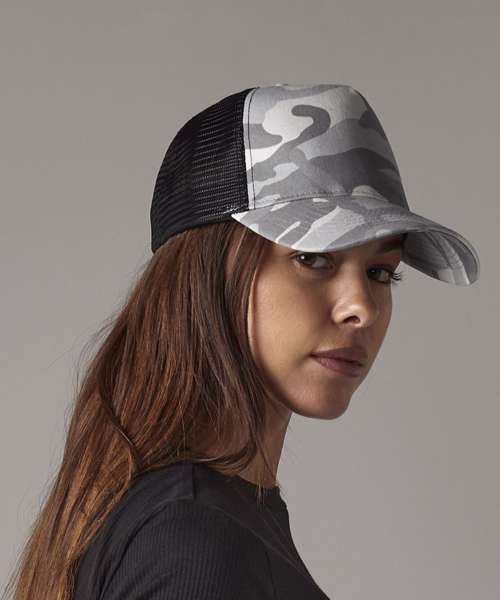 Tear away label for ease of rebranding. Retro style snapback size adjuster. Camouflage detailing. 5-panel design. Pre-curved peak.