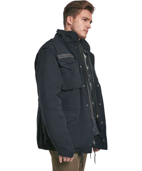 The M65 Giant jacket in vintage style has a real cult characteristic. Perfectly suitable for winter with a zipper to detach the quilted inner jacket made of nylon and a warm teddy-fabric lining.The outer jacket is made of premium, washed cotton and can also be worn without the lining as a transition jacket in spring or autumn. Typically M65 the Giant has 2 big chest pockets, 2 spacious flap pockets on the front, a covered cotton hood with drawstring, complete with poppers on the shoulder.