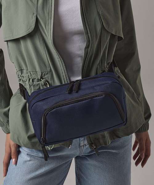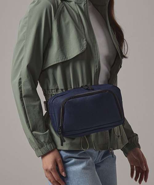 Adjustable webbing belt with secure clip fastener. Headphone port. Zippered rear pocket. Large zippered main pocket. Internal mesh pocket. Key hook.