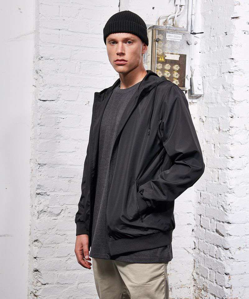 Casual and functional basic windbreaker for men made of 37% recycled polyester - perfect for refinement. Classic cut with ribbed hem and sleeves, a hood with mesh lining and a full-length zipper. Thanks to the insert in the back and the lining hem with zipper, the piece can easily be refined using various techniques.