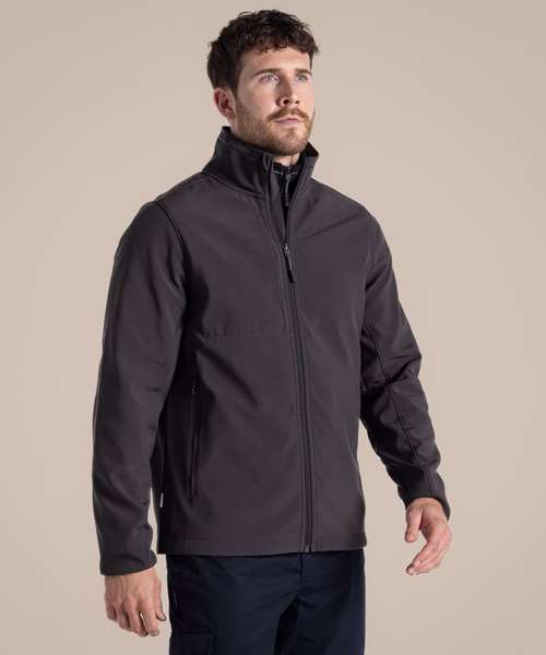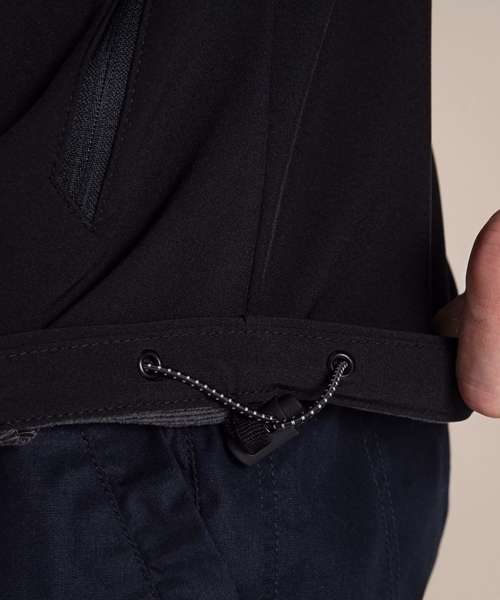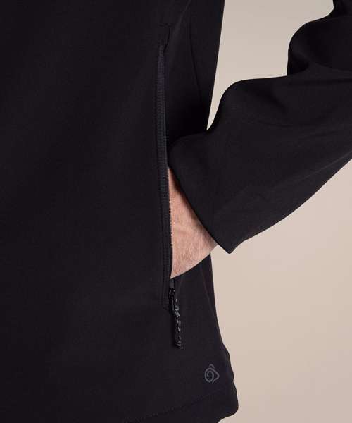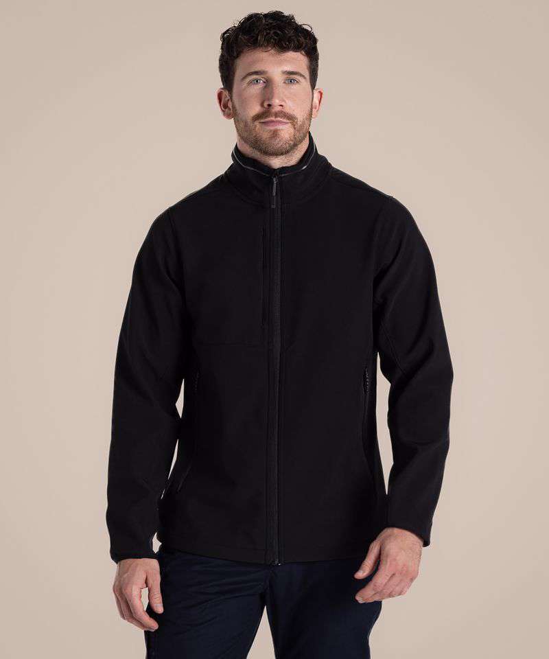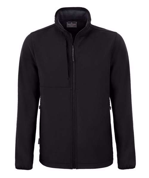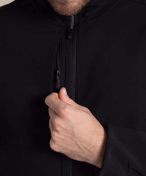 Water-resistant and windproof softshell jacket with 3 pockets. Recycled polyester elastane softshell with EcoShield DWR finish. Striped microfleece back and recycled zip tapes.