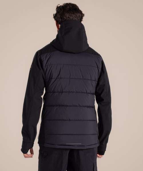 Designed to deliver effortless warmth in cooler conditions, this durable hooded jacket is a great workwear staple. Its stretch softshell construction features a snug microfleece back with baffled body panels for extra core insulation. The H2OShield DWR finish helps to shrug off showers, while odour-control panels help keep you fresh.