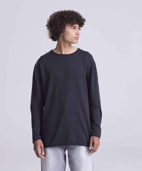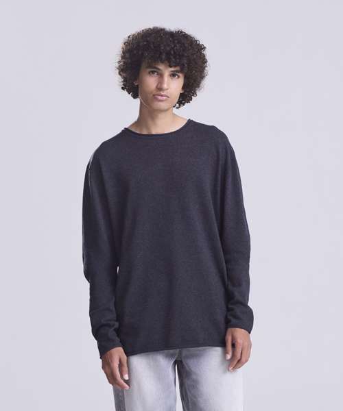 Lightweight sweater made from regenerated cotton. Set-in sleeves with rolled cuffs , hem and collar.