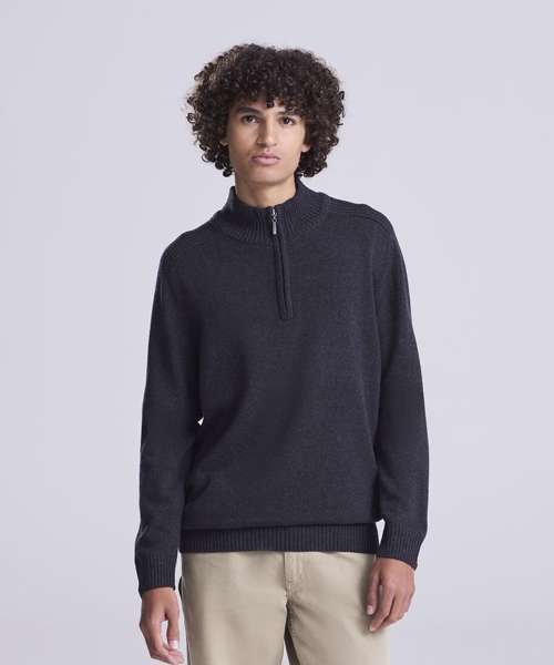 Long sleeve sweater made from regenerated cotton with tall collar and ¼ zip neck. Contrast rib stitches at shoulders cuff and hem.