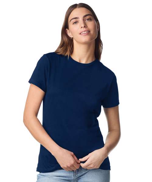 Fitted silhouette with side seam. High stitch density for smoother printing surface. Tearaway label. Seamless twin-needle 1.3cm collar. Taped neck and shoulders, twin-needle sleeves and bottom hem. Also available in kids.