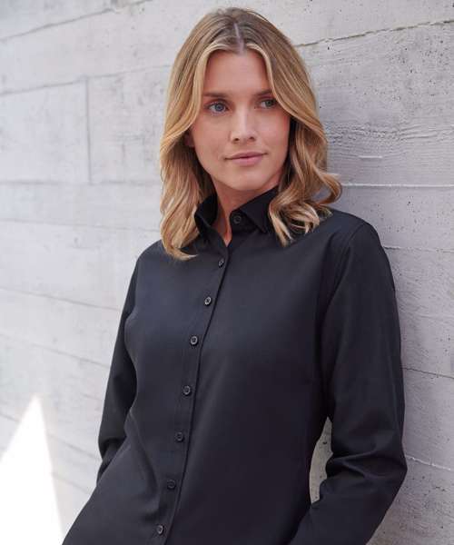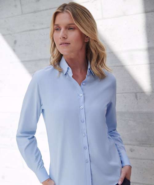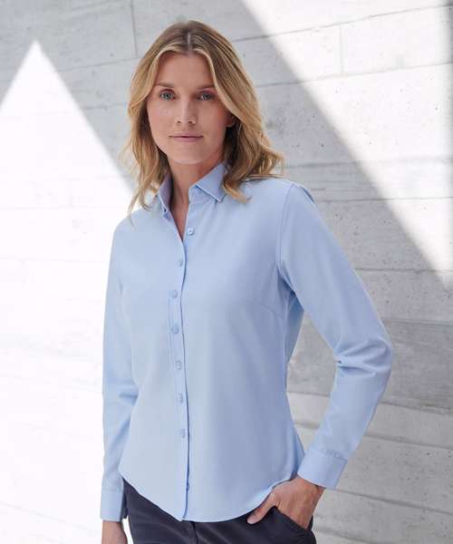 Women’s long sleeve ‘cotton-feel’ Coolplus® shirt, made from 100% Coolplus® permanent wicking fabric with cotton hand feel. Regular fit with shaped side seams. Front and back darts. Back yoke. Front placket with eight self-coloured pearlised buttons. Button-down collar. Adjustable cuffs. Tag-free. Wrinkle-resistant.
