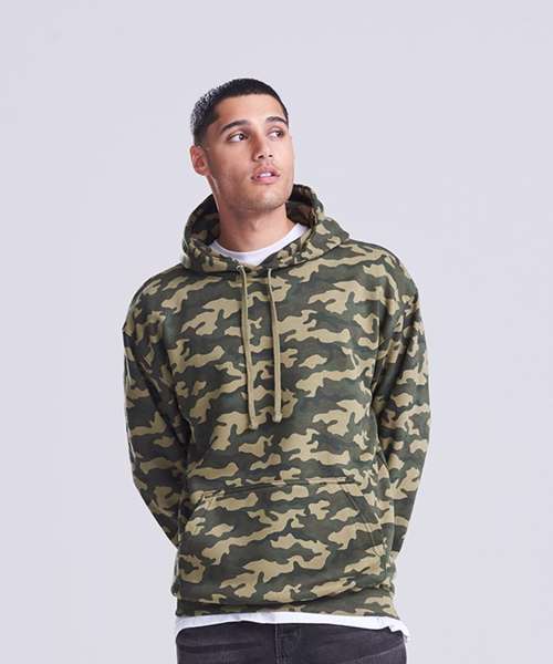 Twin-needle stitching detail. Classic all over camo print. Flat lace drawcords. Double fabric hood. Kangaroo pouch pocket. Ribbed cuffs and hem. Soft cotton faced fabric creates ideal printing surface. Simple tear-out label makes it perfect for rebranding. Flat lace drawcords. Brushed inner fleece.