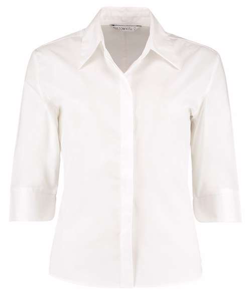 Soft interlined fused stand-up open collar. Covered front placket. Rounded hem. Side vents. Rounded cuff with vent. Centre back seam. Two back darts. Spare button. Kustom Kit® woven back neck label.