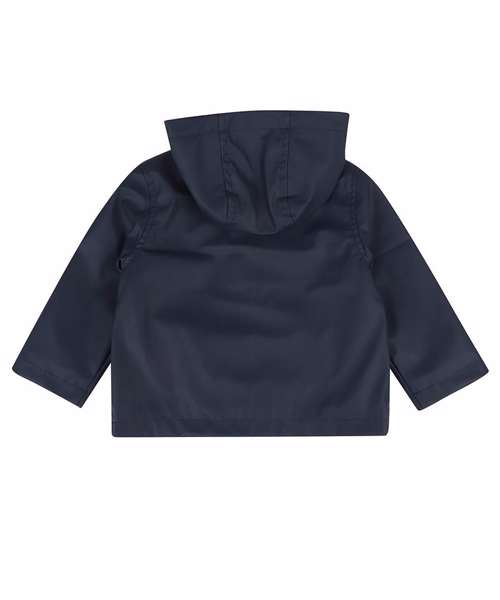 PVC rain jacket with stripped single Jersey 100% cotton lining. Patch front pockets. Zipper and popper opening. Straight hem and cuffs. Lined hood. Size tab only.