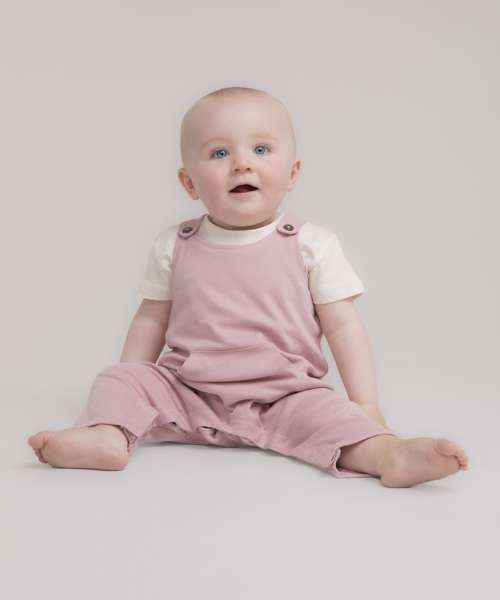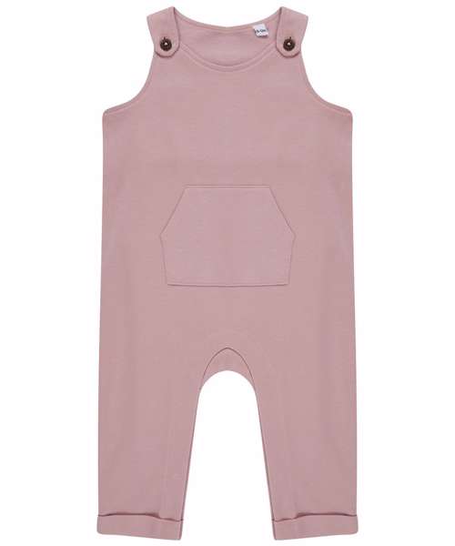 Cotton dungarees made in sustainable fabric with horn-button shoulder fastening. Central kangaroo pocket. Rolled and stitched leg hems with integral poppers around the inseam. Single Jersey facing. Tag-free.
