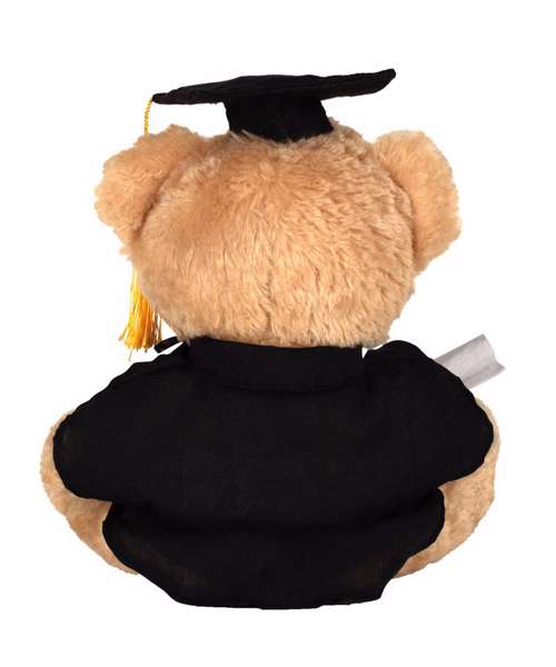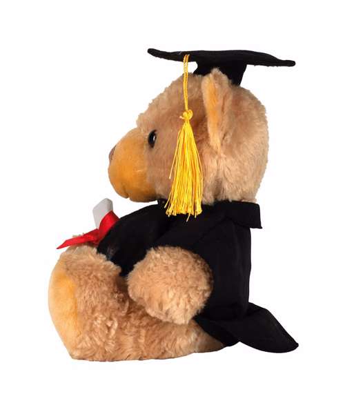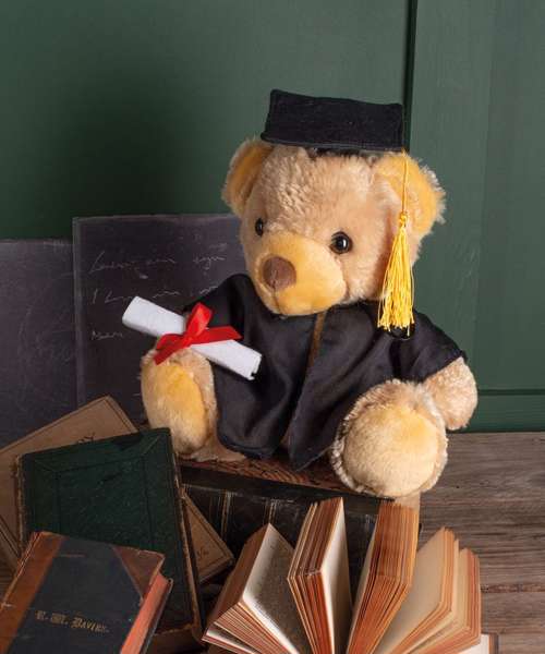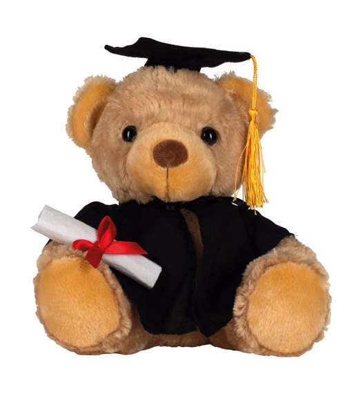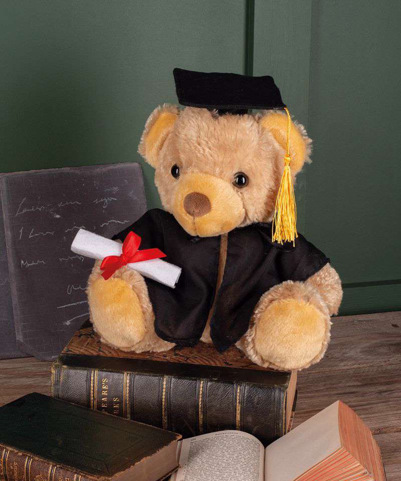 They did it! Mumbles proudly presents the Graduation bear, to help celebrate their academic achievements in further education. Wearing a gown (removable, for ease of decoration) and a cap with tassel, this bear makes an appropriate graduation gift, proudly holding a scroll with red ribbon. Features traditional glass eyes. Complies with EN071 European Toy Safety regulations. Remove all hang tags and their fasteners before giving these items to a child. Suitable from 36 months.