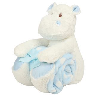 Soft plush hippo with contrast blanket. Contrast feet, nose, and horns. Sewn eyes. Hook and loop fastening on feet and paws. Blue and white spotted velour blanket. Complies with EN71 European Toy Safety regulations. Remove all hang tags and their fasteners before giving these items to a child. Suitable for all ages.