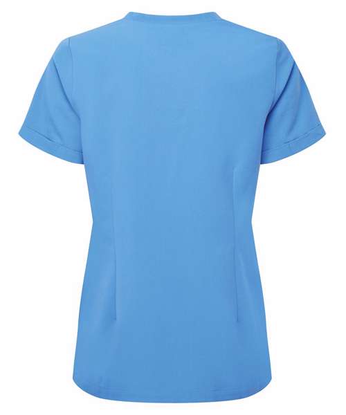 Women’s short sleeve scrub tunic. Comfortable four-way stretch. Breathable, easycare, crease-resistant fabric. V-neck, turn-up sleeves and two front pockets. Back darts, side vents and modern fit. Decorate with embroidery and/or print. Contains certified recycled polyester.