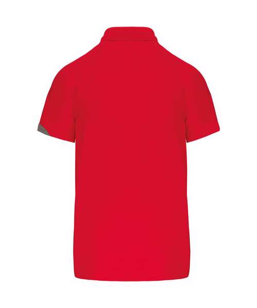 100% polyester. Quick drying fabric. Contrast panels. Flat knit collar. 2 button placket. matching cover stitch. Twin needle finishing.