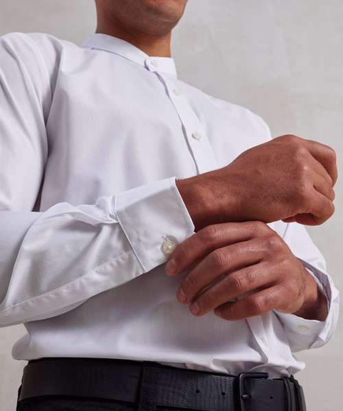 Long sleeve unisex shirt. Double button cuff and sleeve guard. Typical banded grandad collar with top button fastening. Easycare fabric.