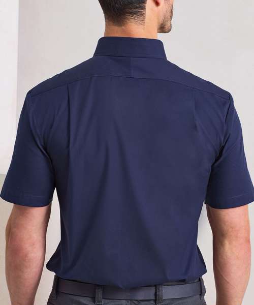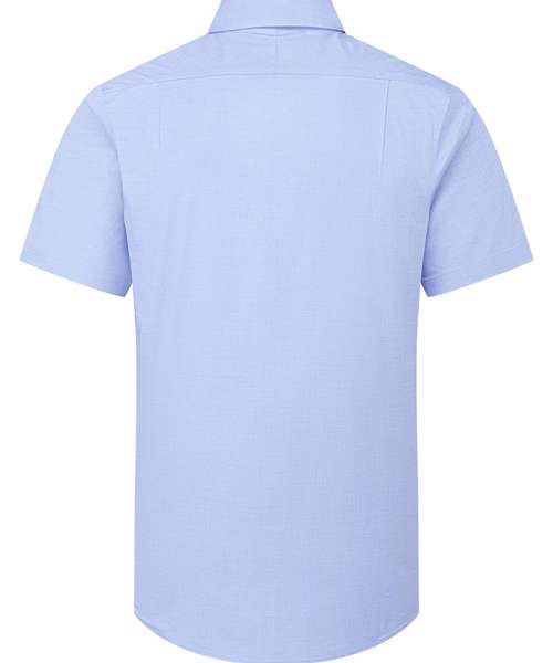 Short sleeve shirt in mercerised cotton, which enhances its overall look, feel and performance. Contains organic cotton and elastane for stretch and shape. Button-down collar. Self-coloured buttons with pearlised buttons on white. Back yoke for fit over the shoulders and back pleats to assist the shape. Curved hemline.