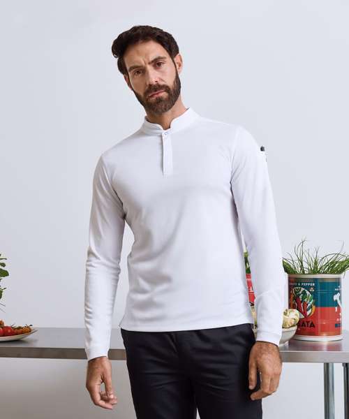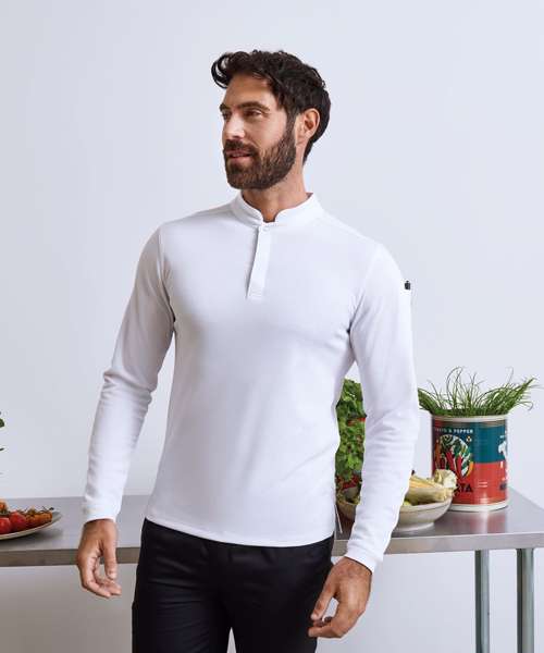 Long sleeve shirt in Premier’s moisture-wicking, breathable Coolchecker® fabric. Mesh back panel provides ventilation and airflow. Banded neckband with single press-stud button. Mandarin collar stand. Covered placket with two press-stud buttons. Press-stud button to the reverse to hold an apron in place on the neckband. Pen pocket on the upper left sleeve. Ribbed-knit cuff for a neat finish on the wrist. Slide slits on the hemline. Made with 100% certified recycled polyester.