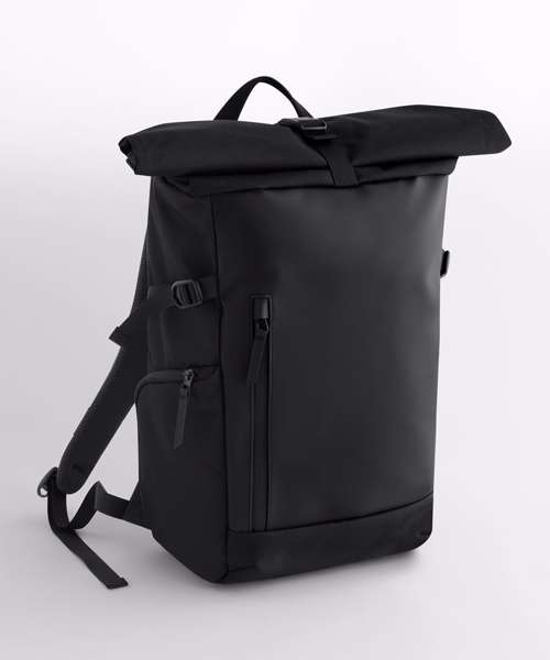 Padded laptop compartment, compatible up to 16”. Elasticated side pocket. Exterior zipped front pocket for easy decoration. Zipped side pocket with internal mesh pockets. Internal key clip. Padded back panel. Roll-top closure. Padded, adjustable air mesh shoulder straps. Rear luggage strap. Compression straps. Padded grab handles. Adjustable chest strap. TearAway label for ease of rebranding. Contains 100% GRS-certified recycled polyester, certified by Control Union CU811033.