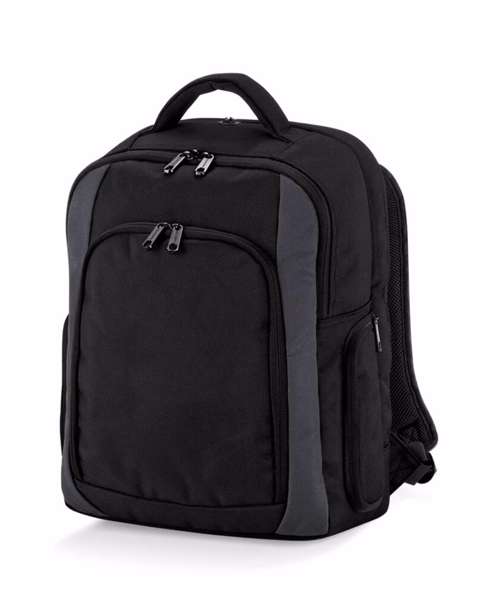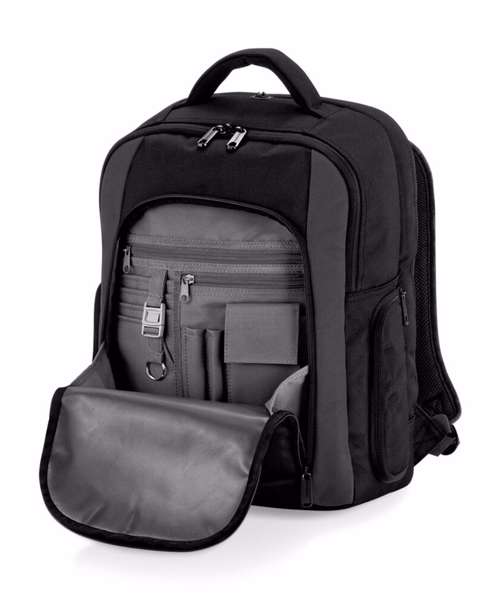 Media pocket and headphone port. Padded laptop compartment. Laptop compatible up to 15.6". Padded adjustable shoulder straps. Front pocket organiser section, side zippered pockets, and water bottle holder. Grab handle.