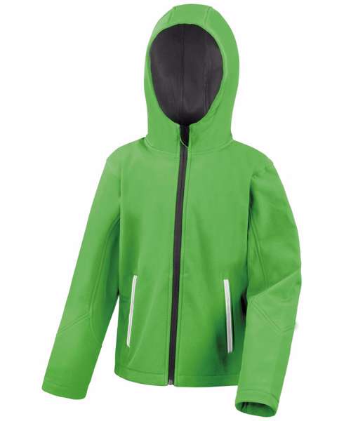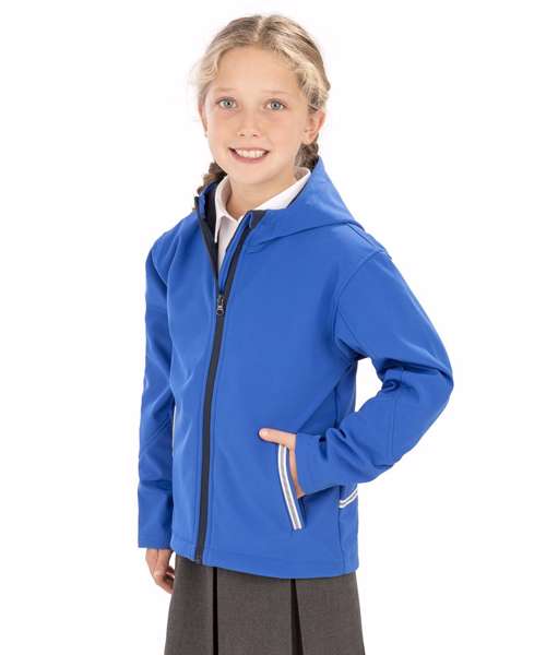 Great design and function for this 3-layer children's softshell jacket microfleece inner for extra warmth It also benefits from a full integral hood for added cold weather protection. Durable water-repellent finish, breathable, and windproof.