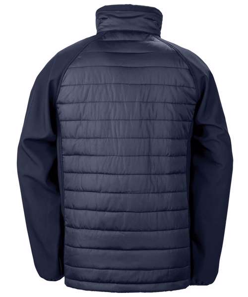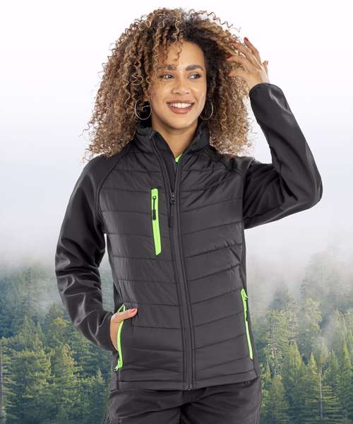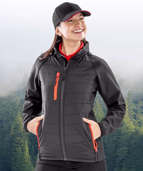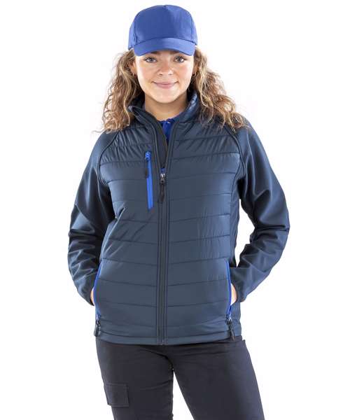 On-trend padded plus softshell combination. Supersoft, lightweight and warm. Printable softshell sleeves. Ready to brand. Quiet to wear. Contrast colour pocket zips. Full front zip with chin guard. Stand-up padded collar. Padded body. Soft bound cuff. Black zip pulls. Contains recycled polyester.