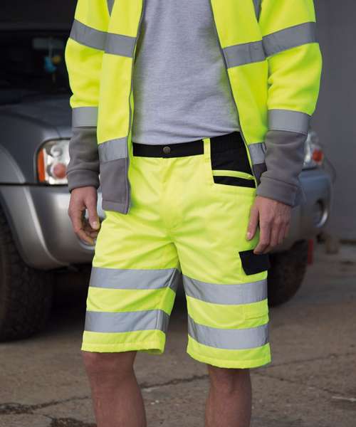 Functionality and high visibility performance are delivered without compromise in these tough and rugged safety cargo shorts. Multiple pockets, bar tacked stress points and hammer loop bring the performance whilst elasticated waistband, knee pad pockets and reflective leg bands bring the comfort and safety. Everything you expect and more from an EN20471 Class 2 safety short.