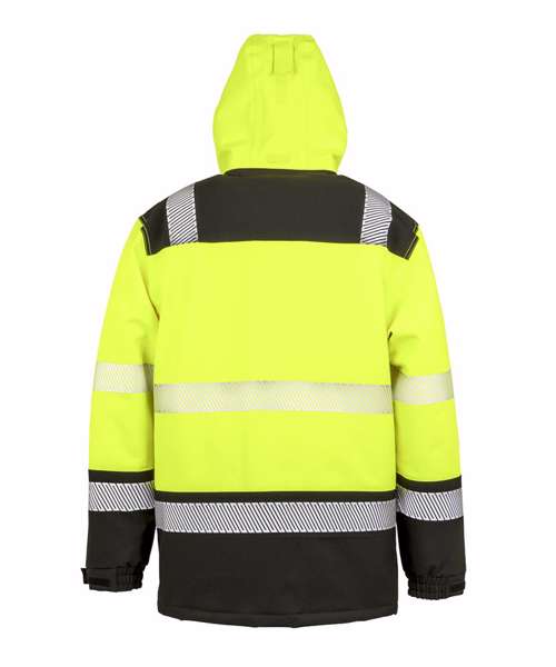A soft stretch, high visibility safety, waterproof, windproof and breathable garment in printable fabric. Highly technical with features such as tear release and part elasticated cuffs, reflective print body bands and an adjustable foldaway hood, finished off with stylish black colour contrasting.