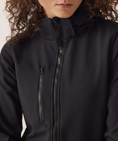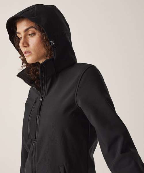 Warm-backed woven softshell XPT waterproof and breathable 3 layer membrane fabric. Fully printable outer fabric, with wind resistant inner membrane. Detachable softshell fabric hood, adjustable shock cord at face and cuff adjusters. 2 zipped lower pockets and 1 zipped chest pocket. .