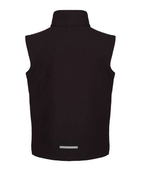 Warm-backed, woven, stretch softshell fabric. Ideal for screen, transfer and vinyl printing. Inner zip guard. Two zipped pockets. Reflective print detail. Made using recycled materials.