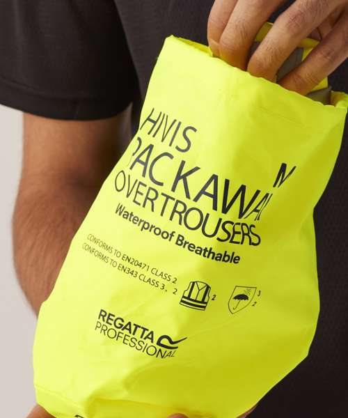 Waterproof and breathable Isotex 10000 polyester 150D Oxford fabric with taped seams, Conforms to EN343 class 3:2. Conforms to EN20471: 2013 +A1: 2016 Class 2 (trousers) (orange also RIS-3279-TOM). Quick access hip pockets and elasticated waist. Packs away into a separate bag with hanger loop for easy storage.