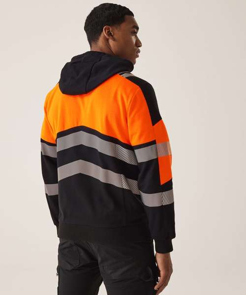 100% brushed back polyester fabric soft touch – 310gsm. Certified EN ISO 20471:2013 +A1:2016 Class 2. Heat-applied reflective tape, with segmented tape on strategic panels for additional comfort. Grown-on hood with adjusters. Kangaroo pocket to front. Ribbed collar and cuffs. ID reflection – angled chevrons identify which way you are facing. Made with recycled content.