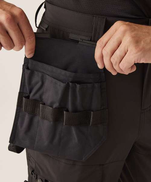 The Hi-Vis X-Pro Stretch holster trousers (Class 1) from Regatta Professional are a fusion of protective, hi-tech and unparalleled comfort. These meticulously crafted trousers embody a design-led approach, seamlessly blending style with functionality. Constructed from 4-way stretch and water-repellent fabric, they guarantee unmatched comfort, while the laser-cut design at the back knee enhances breathability during strenuous tasks. These work trousers will stand the test of time with their Cordura® fabric top-loading kneepad pockets. They feature a hammer loop and 15-strategically placed pockets for tools and an ID holder, while fluorescent fabric keeps you visible in low-light settings.