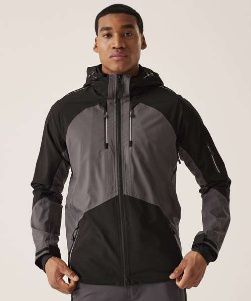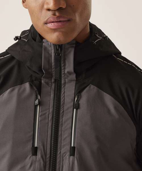 Waterproof and breathable Isotex 10000 stretch polyester fabric. Breathability rating: 10,000g/m²/24 hours. Conforms to EN343:3.3. Hard-wearing stretch ripstop fabric for added durability. Reach Technology – underarm gusset for maximum range of movement and unrestricted arm lift. Technical waterproof zips. Made using recycled materials.