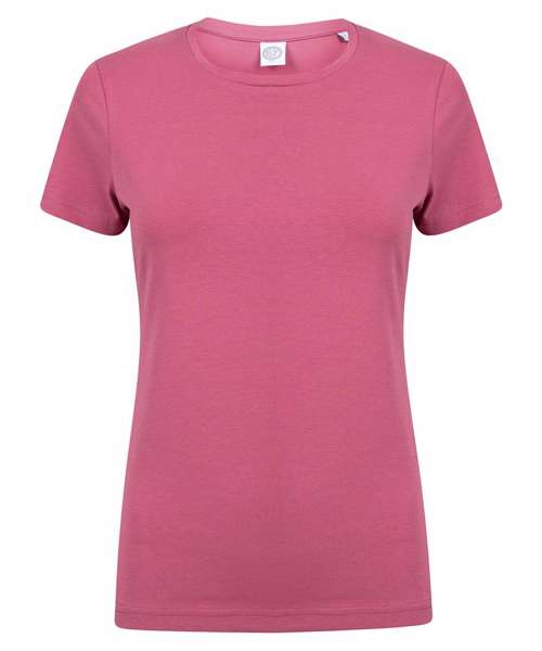 Feel good women's stretch t-shirt with enzyme wash for unique soft hand-feel. 96% cotton, 4% elastane for improved fit, comfort and shape retention. Modern long-line fit. Crew-neck with back neck binding and soft stretchy rib neckline. Features tear out label.