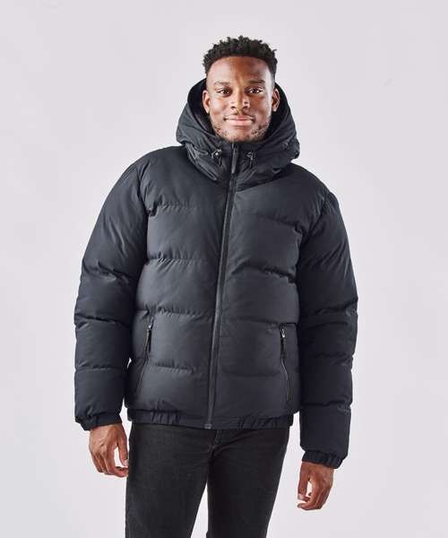 Pure Earth by STORMTECH™. STORMTECH 2-Layer H2XTREME® 15000/10000 waterproof/breathable outer shell. STORMTECH Thermolex™ high loft synthetic down. Durable, PFC-free, water-repellent finish. High-performance, windproof outer shell. Articulated elbows. Bomber-style length. Elastic hem and cuff trim. Ultra-warm, zipped hand pockets. Full-coverage insulated hood with face shield. Zip-off insulated hood trim, reinforced. Flexible hood opening. Internal storm flap with brushed tricot. Thermal reflective lining. Internal mesh stash pockets. Internal zipped chest pocket. Decoration access.