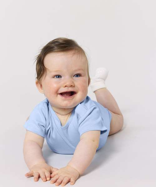 Short sleeve baby bodysuit. Set-in sleeve. 1x1 rib binding at neck collar and leg opening. Snap placket at shoulder. Snap closure at bottom.