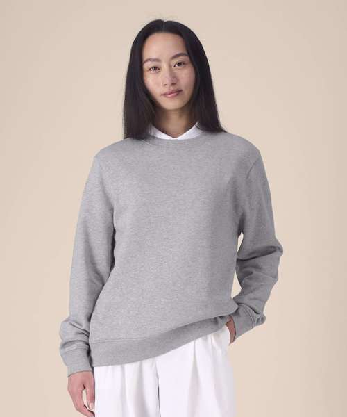 Women’s recycled cotton crew neck sweatshirt. Set-in sleeves. 1x1 rib at collar, sleeve cuffs and hem. Twin-needle topstitching on the seams at the shoulders, armholes, sleeve cuffs and hem. Inside herringbone back neck tape. Self-fabric half-moon at the back neck. Contains 50% GRS-certified recycled cotton and 50% OCS-certified organic cotton, certified by Control Union CB-CUC-1393082.