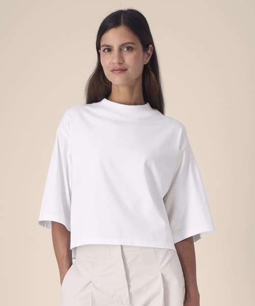 Women’s recycled cotton crop t-shirt. Set-in sleeves. 1x1 rib at neck collar. Self-fabric back neck tape. Twin-needle topstitching at armholes, sleeve cuffs and hem. Contains 50% GRS-certified recycled cotton and 50% OCS-certified organic cotton, certified by Control Union CB-CUC-1393082.