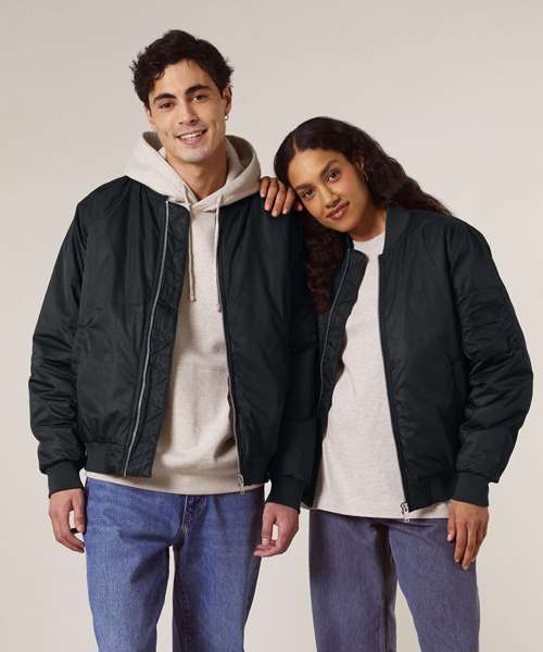 Premium unisex bomber jacket in 100% recycled polyester. Timeless, versatile style in a medium fit. Improved padding and decoration results. Ideal for music merchandise.