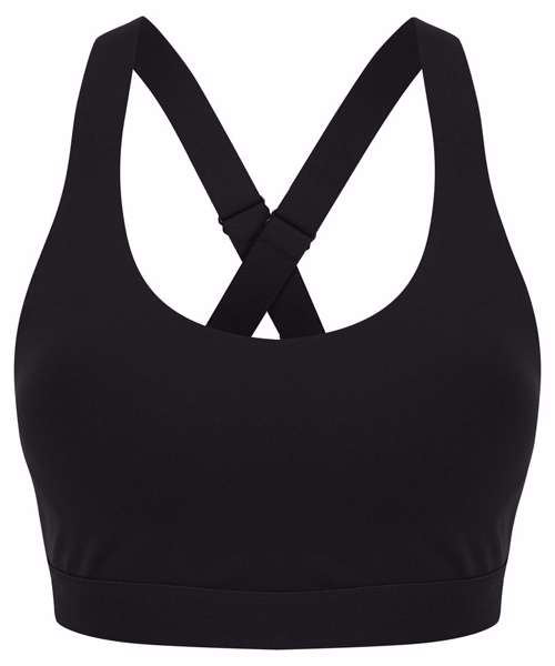 Women's core bra with medium impact. Round neckline with cross over elastic strap back. Bra clasp fastening. Permanent cups, non removeable. Tear-out label.