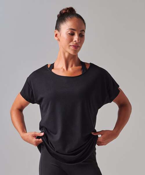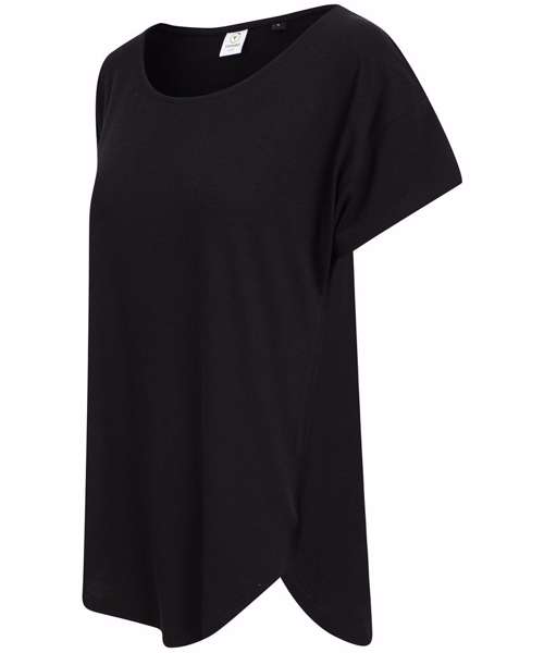 Women's scoop neck T with oversized fit and scoop neck. Dropped shoulder seams and dropped tail hem on back. Super soft fabric. Tear-out label.