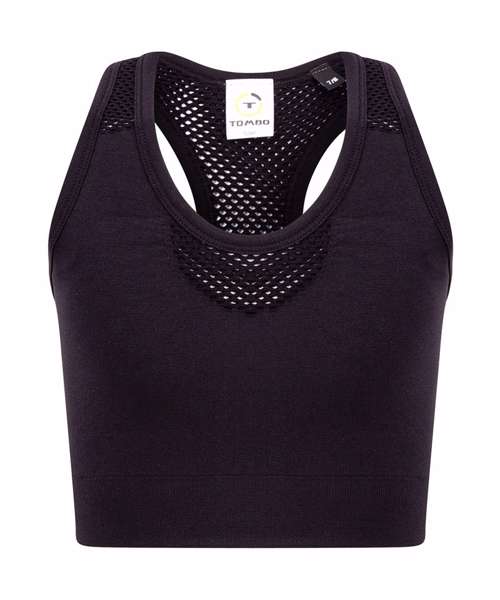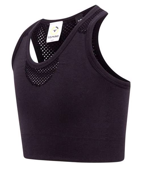Active crop top and racerback. Self-fabric mesh inserts on front straps, V insert on front and on racerback panel. Self-fabric binding around neck, armholes and back. Tombo tear-out label.