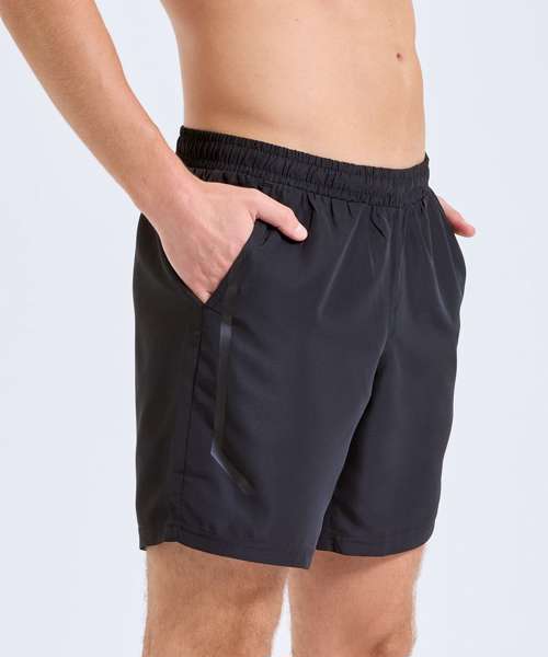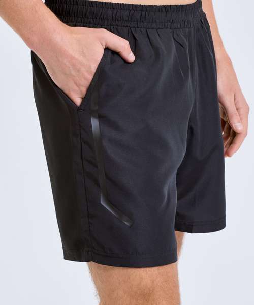 Wicking fabric. Elasticated waist. Woven fabric. Mid thigh length. Lightweight. Black heat seal tape detail on the front. Inside leg- 18cm. We recommend using block out vinyl and inks.Product contains no branded neck or waist label. Removable Kimble or looped garment tags. Inner seam label holds important product information on one label with a second label containing brand information which can be cut-away.
