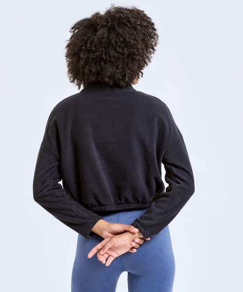 Cropped pull-over fleece with high neck. 1/4 neck popper fastenings to front. Elasticated waistband. We recommend using block out vinyl and inks.Product contains no branded neck or waist label. Removable Kimble or looped garment tags. Inner seam label holds important product information on one label with a second label containing brand information which can be cut-away.
