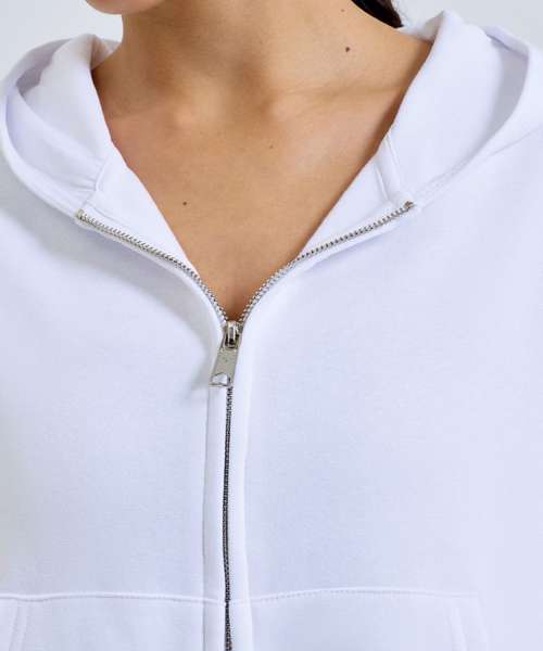 Oversized, cropped, zipped hoodie. Zip to centre. Drawstring tie to waist. Kangaroo pockets to front. Contains recycled polyester fabric. The product contains no branded neck or waist label. Removable kimble or looped garment tags. The inner seam label holds important product information on one label with a second label containing brand information which can be cut-away.