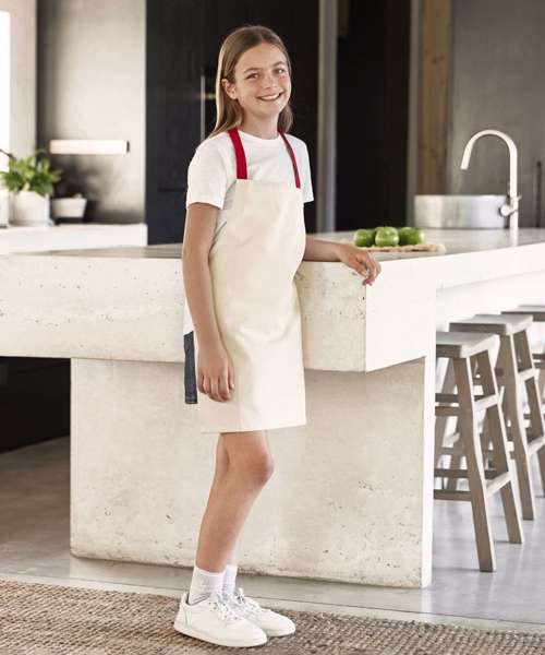 Full bib apron. Cotton Herringbone neck tie with adjustable Rip-Strip™ fastening safety closure. Cotton Herringbone 60cm waist ties. Fairtrade certified.