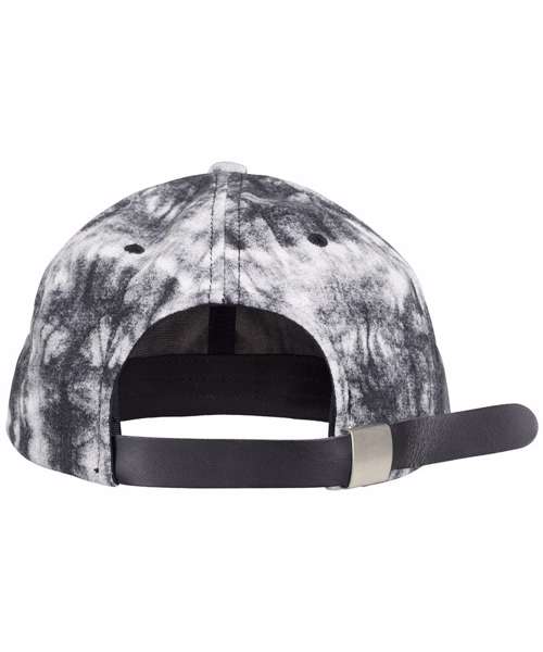 Low-profile tie-dye cap. Subtle black-and-white batik wash. Casual dad cap shape. Genuine leather strap with metal buckle.